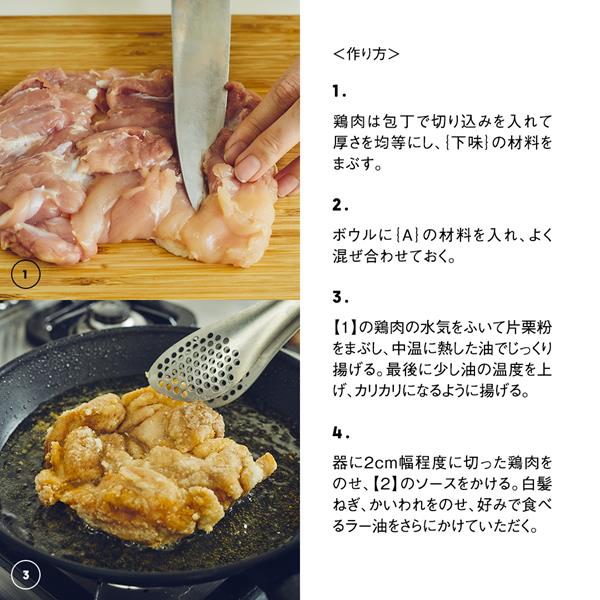 3【1】の鶏肉の水気をふいて片栗粉をまぶし、中温に熱した油でじっくり揚げる。最後に少し油の温度を上げ、カリカリになるように揚げる。