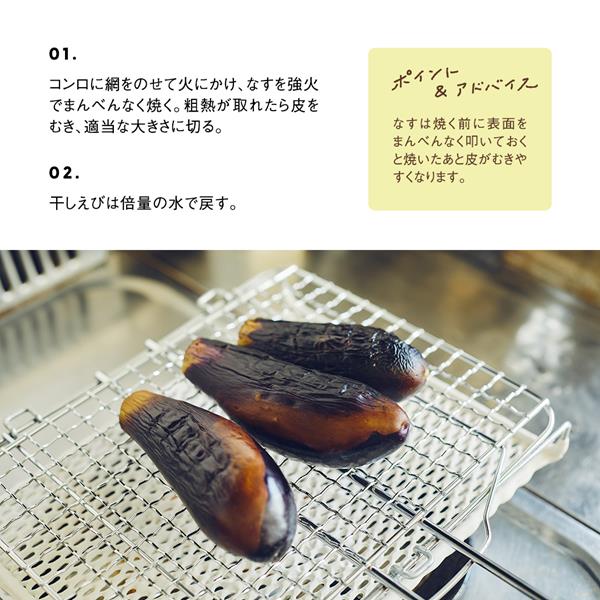 1コンロに網をのせて火にかけ、なすを強火でまんべんなく焼く。粗熱が取れたら皮をむき、適当な大きさに切る。