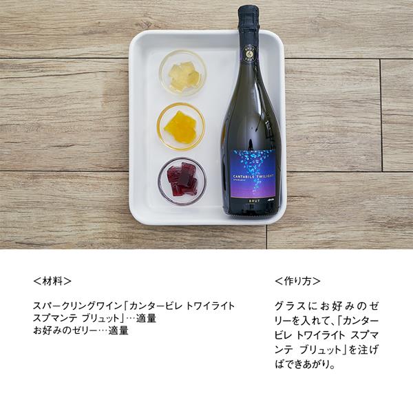 グラスにお好みのゼリーを入れて、「カンタービレ トワイライト スプマンテ ブリュット」を注げばできあがり。