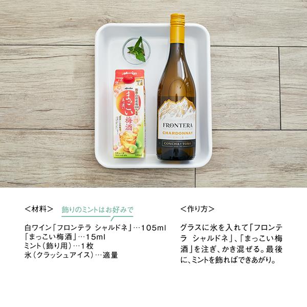 グラスに氷を入れて「フロンテラ シャルドネ」、「まっこい梅酒」を注ぎ、かき混ぜる。最後に、ミントを飾ればできあがり。