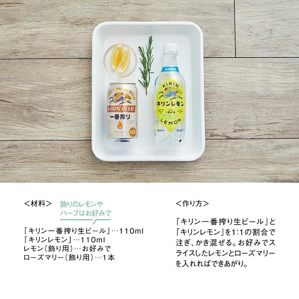 「キリン一番搾り生ビール」と「キリンレモン」を1:1の割合で注ぎ、かき混ぜる。お好みでスライスしたレモンとローズマリーを入れればできあがり。