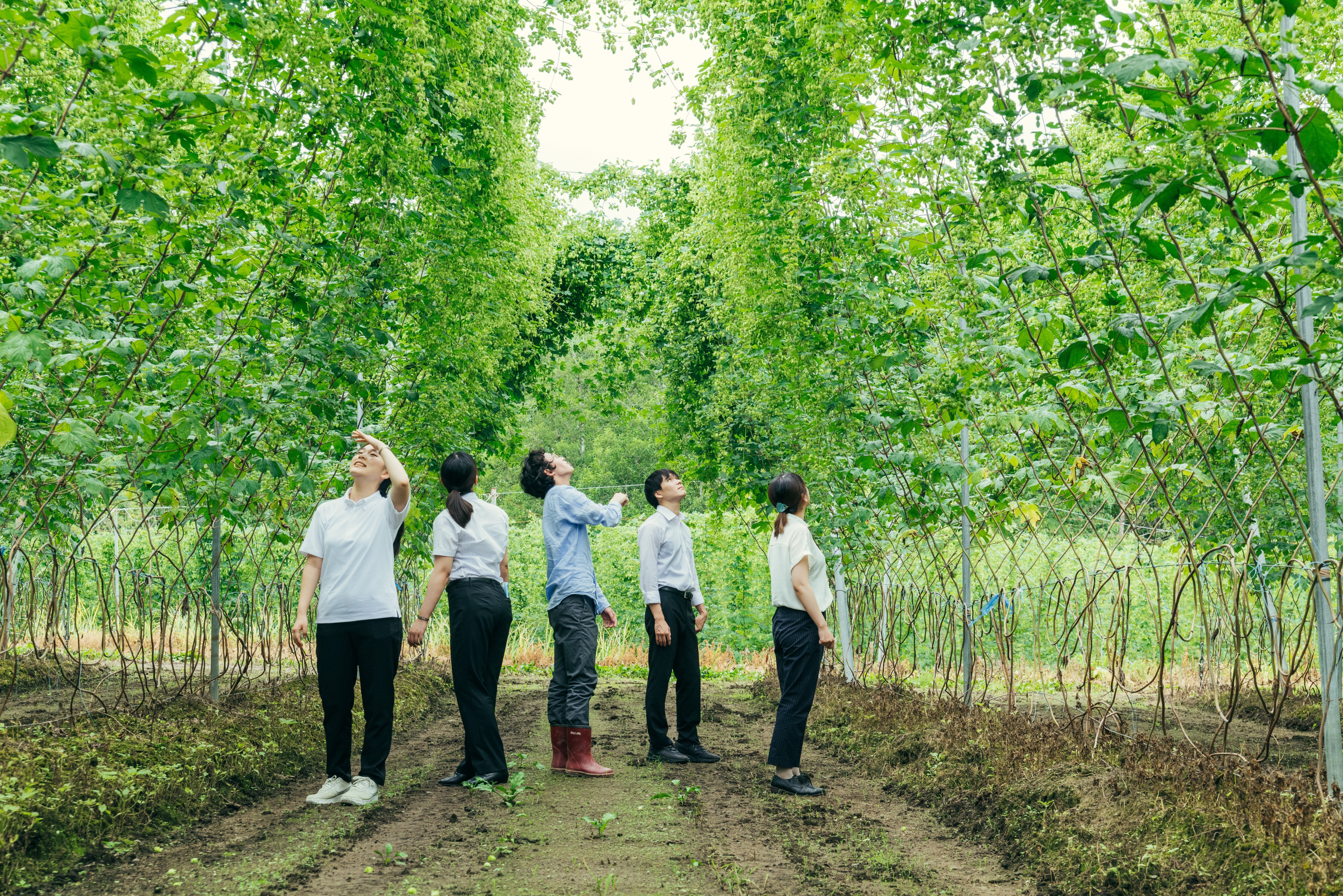 畑に到着すると、目の前に広がっていたのは、迫力ある緑が美しいホップのグリーンカーテン。想像以上に背の高い、色鮮やかな景色に、インターン生も目を輝かせながら空を見上げていました。よく見ると、空高く伸びたツルには、収穫を控えた鞠花がたわわに咲いています。