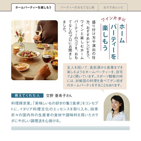 盛り付け方や演出の仕方、おすすめレシピまで、ワインと楽しむホームパーティーのコツを、おもてなしのプロにお聞きしました。