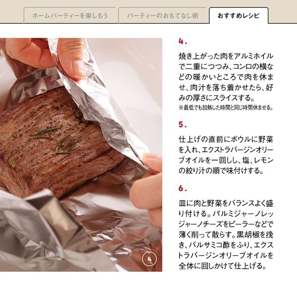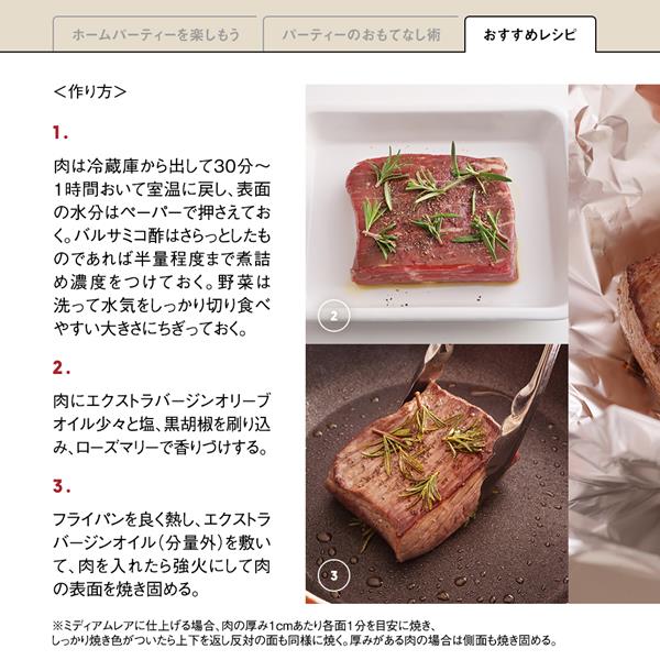 ※ミディアムレアに仕上げる場合、 肉の厚み1cmあたり各面1分を目安に焼き、しっかり焼き色がついたら上下を返し反対の面も同様に焼く。厚みがある肉の場合は側面も焼き固める。 -