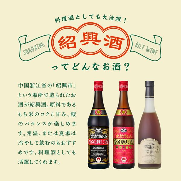 中国浙江省の「紹興市」という場所で造られたお酒が紹興酒。原料であるもち米のコクと甘み、酸のバランスが楽しめます。常温、または夏場は冷やして飲むのもおすすめです。料理酒としても活躍してくれます。