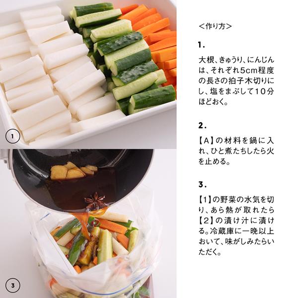 3【1】の野菜の水気を切り、あら熱が取れたら【2】の漬け汁に漬ける。冷蔵庫に一晩以上おいて、味がしみたらいただく。
