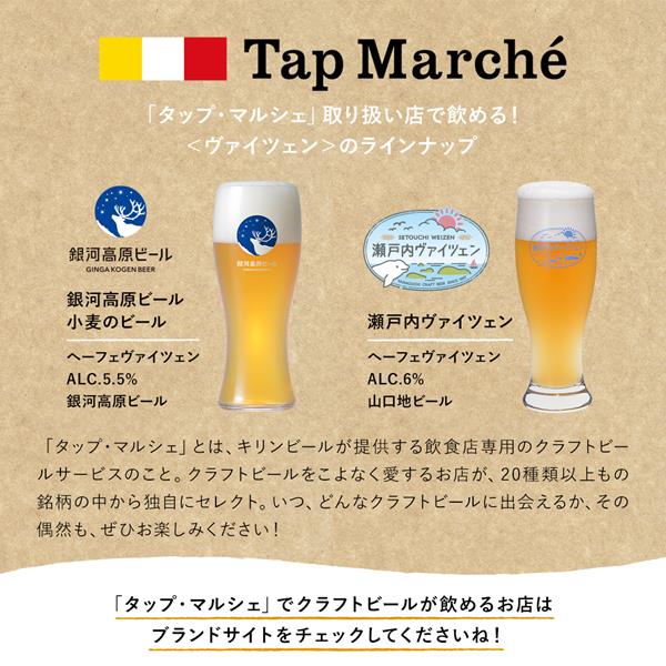 「タップ・マルシェ」とは、キリンビールが提供する飲食店専用のクラフトビールサービスのこと。クラフトビールをこよなく愛するお店が、20種類以上もの銘柄の中から独自にセレクト。いつ、どんなクラフトビールに出会えるか、その偶然も、ぜひお楽しみください!