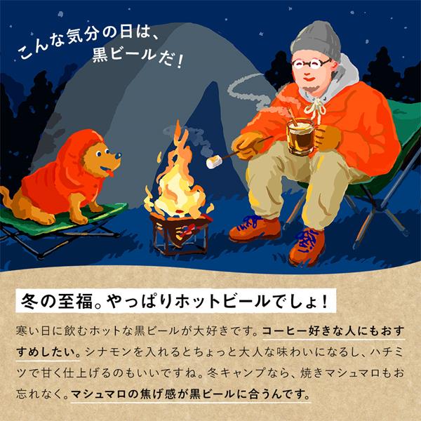 寒い日に飲むホットな黒ビールが大好きです。コーヒー好きな人にもおすすめしたい。シナモンを入れるとちょっと大人な味わいになるし、ハチミツで甘く仕上げるのもいいですね。冬キャンプなら、焼きマシュマロもお忘れなく。マシュマロの焦げ感が黒ビールに合うんです。