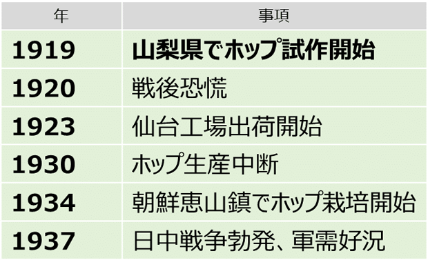 しかし1914年の第一次世界大戦の勃発により、ドイツが敵国に。輸入は途絶してしまいます。このホップ調達の危機に、キリンは1919年から国内でのホップ栽培を本格的に取り組むこととし、山梨で試作を始めます。しかし栽培技術が未熟な当時の日本産ホップの品質は、やはり外国産に劣るものでした。その後アメリカやロシア産のホップを輸入できたこともあり、キリンの国内ホップ生産の試みは一時中断します。