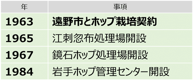 遠野市がホップ栽培に参入した当時は、高度経済成長期。ビール消費は急増し、日本産ホップの需要も拡大していました。1960年代半ば頃までの日本産ホップは輸入価格より安価だったため、値段が安く品質も高い国産品は原料費削減の上からもメリットがありました。当時の日本のホップ自給率は約80%でしたが、既存の栽培地では増産に陰りが見えており、遠野市のホップ栽培新規参入はキリンにとっても大きな意味を持ちました。後発の遠野においては当初より近代化、省力化、大型化が意識され、栽培実績の増加にもつながりました。
