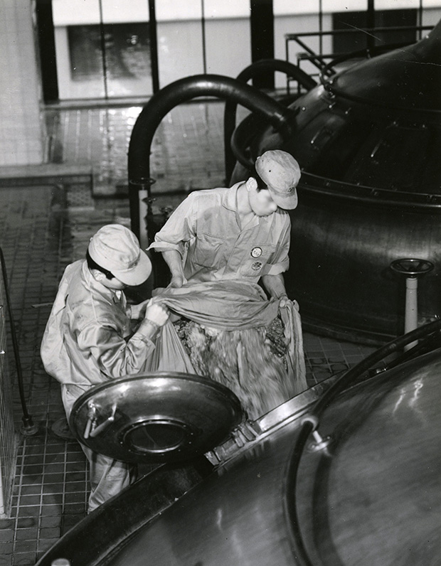 麦汁煮沸釜へホップの投入(キリンビール社史戦後編1969年発行)