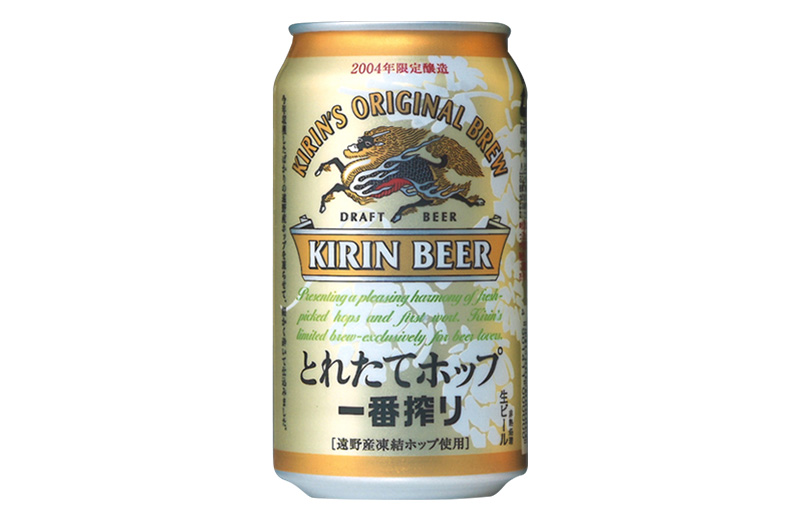 キリンビールは2002年、「今しか飲めない特別な一番搾り」として、その年に収穫した日本産ホップを使用した「キリン 毬花一番搾り<生>」を発売しました。後継商品となった「一番搾り とれたてホップ生ビール」では、遠野産ホップの使用をアピール。2004年の新発売時のパッケージにも、「遠野産凍結ホップ使用」と記載していました。