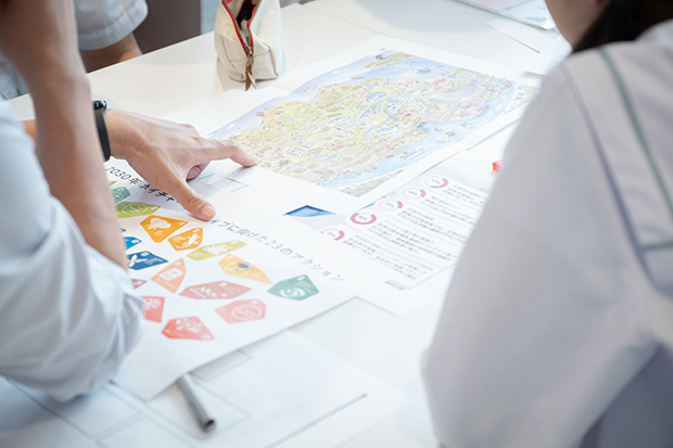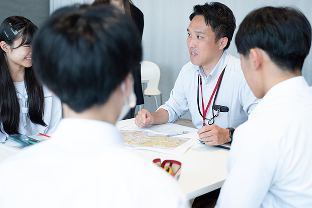 ネイチャーポジティブ(※)について意見を交わしたグループは、生物多様性を実現した社会を示した図を見みながら、私たちの社会のなかにどのようにネイチャーポジティブが関係しているかをみんなで考えていました。