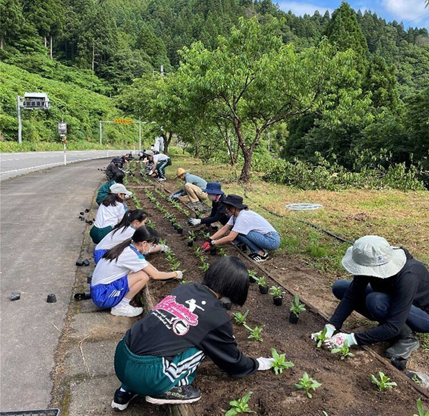 美山中学校では、国道沿いで除草や植栽を行う「フラワーロード奉仕活動」など、高齢化が加速する地域の美化活動に生徒が自主的に取り組んでいます。