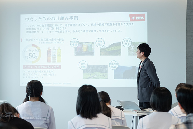キリンでサステナビリティ戦略を担当するメンバーは、商品がお客さまの手に届くまでにどのような社会課題と関わり、キリンはどう解決しようとしているのかについて、中学生の皆さんにお話ししました。
