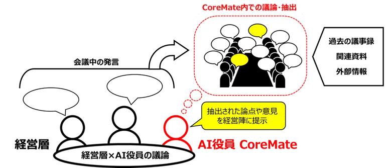 「CoreMate」は、キリンのグループ経営戦略会議に導入するために開発しました。多様な専門性と意見を持った12名の人格を構築し、AI人格同士が議論のポイントを整理して抽出した論点を、実際の経営戦略会議に提示するようにしたのです。