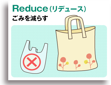 Reduce(リデュース)は、資源(しげん)のムダづかいを減らすこと。たとえば、恐竜(きょうりゅう)のおもちゃを買ったら、それをお店の人が包装(ほうそう)したり、ビニール袋(ぶくろ)に入れてくれるよね。でも、ほしいのは中身だけだから、包み紙や袋はいらない。だから、ボクたちがムダな包装を断れば、資源のムダづかいを減らすことができるんだ。