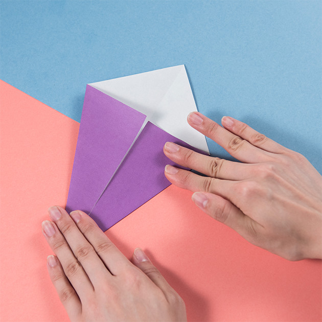一度ひろげ、中心のおり線に向かってダイヤ型になるようにおる。