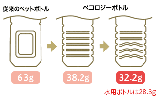 「角張った平板状」のデザインを「丸みを帯びた蛇腹形状(じゃばらけいじょう)」に改良したことで、軽くてうすく、空になったあと手でつぶせてリサイクルも簡単!